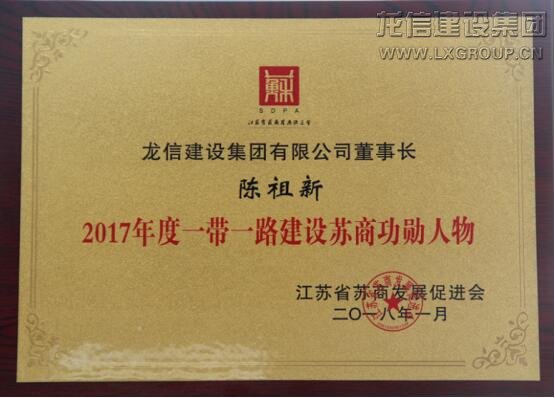 1月19日,由江蘇省蘇商發(fā)展促進(jìn)會(huì)主辦的“2018年(第12屆)蘇商領(lǐng)袖年會(huì)暨2017年蘇商人物系列推選頒獎(jiǎng)典禮”在南京隆重舉行。龍信集團(tuán)董事長陳祖新榮獲“2017年度一帶一路建設(shè)蘇商功勛人物”稱號。