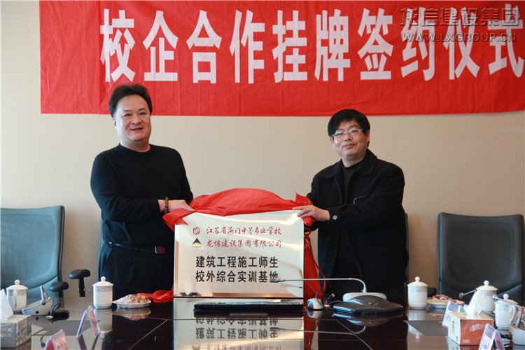 為促進校企深度合作,完善校企雙贏機制,實現校企協同發展, 2015年2月9日下午,在龍信大廈二樓會議室舉行了龍信集團與海門中專共建師生綜合校外實訓基地的揭牌儀式。海門中專的陸衛平副校長、郁建菊主任、張慧琴主管、楊海燕老師、黃其中老師,我集團總經理唐愛東、監事會主席卞勤華、集團常務副總工程師劉瑛、經營部經理賀廣海、施工技術部經理張豪、人力資源部經理黃麗英、人力資源部主管宋斌斌參加了揭牌儀式。