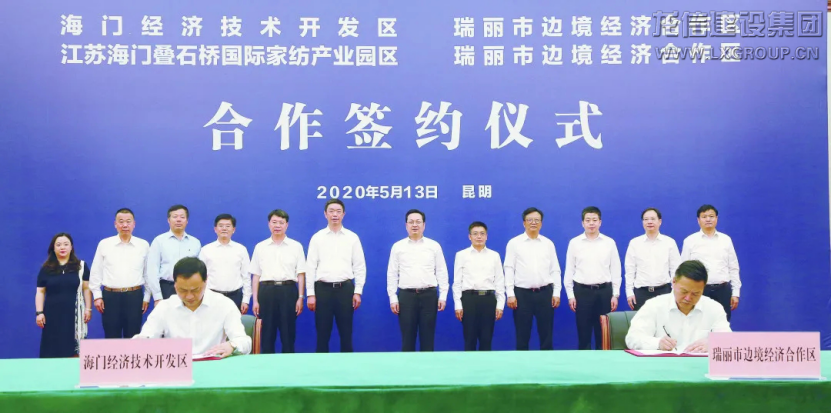5月13日,海門經濟技術開發區、疊石橋國際家紡產業園區與云南省瑞麗市邊境經濟合作區合作簽約儀式在昆明舉行。云南省委常委、統戰部長、副省長張國華,海門市委書記陳勇,德宏州委書記、瑞麗試驗區黨工委書記、管委會主任趙剛,云南省商務廳廳長趙瑞君等共同見證簽約。龍信集團黨委書記、董事長陳祖新作為海門市黨政代表團企業家代表出席此次活動。
