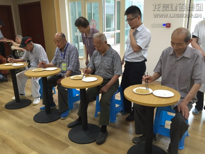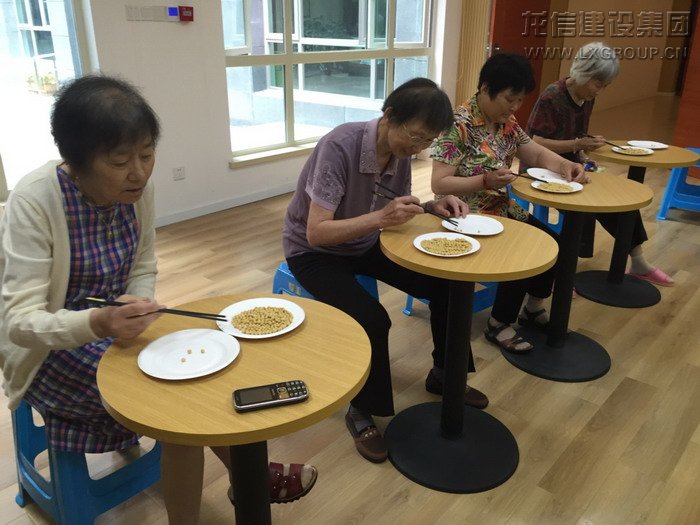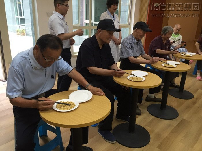 圖為叔叔阿姨正在進(jìn)行筷子夾黃豆比賽