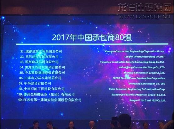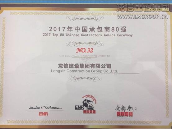 11月30日,由美國《工程新聞紀錄》(ENR)和中國《建筑時報》共同主辦的2017“中國承包商80強和工程設計企業60強”頒獎典禮在蘇州隆重舉行。龍信集團榮列“中國承包商80強”第32位,這已是我集團連續第9年入圍該榜單,充分展現了集團優秀的品牌形象和較強的綜合實力。